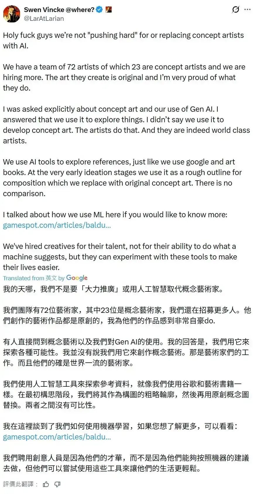 谁知道这个事情愈演愈烈,最终Vincke不得不在X上发表了一段长文来澄清这个问题,并且坚决否认“AI 替代美工”的说法。
