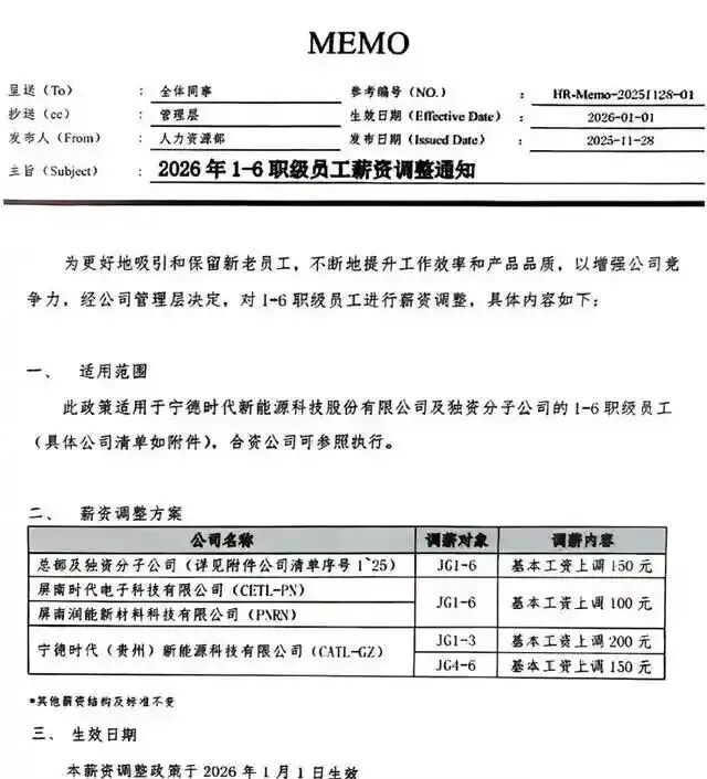 比如宁德时代的涨薪幅度。自2026年1月1日起,在这里从事直接生产工作的员工迎来了薪酬调整。一份通知显示,宁德时代总部及全资子公司1-6级员工基本工资上调150元,屏南时代电子科技有限公司和屏南润能新材料科技有限公司1-6级员工基本工资上调100元,宁德时代(贵州)新能源科技有限公司1-3级员工基本工资上调200元、4-6级员工基本工资上调150元,其他薪资结构及标准不变。