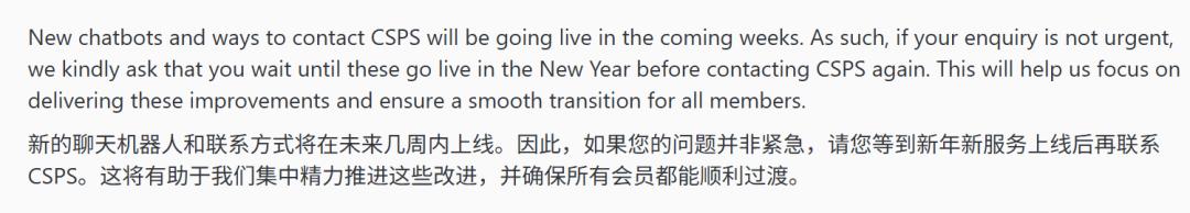 “我们正在不懈努力,打造你们期望的体验。新的聊天机器人以及更多联系方式将在未来几周内上线。如果你的问题不紧急,请等到新年后这些功能上线再联系我们。这样有助于我们集中精力完成改进,确保平稳过渡。”