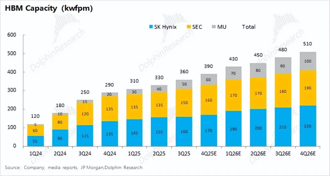 从上文的三家公司合计产能来看,2025年四季度的HBM月产能约为39万片,至2026年四季度HBM的月产能有将达到51万片。考虑到产能爬坡因素,海豚君预估2026年HBM的合计总产能有望达到543万片。