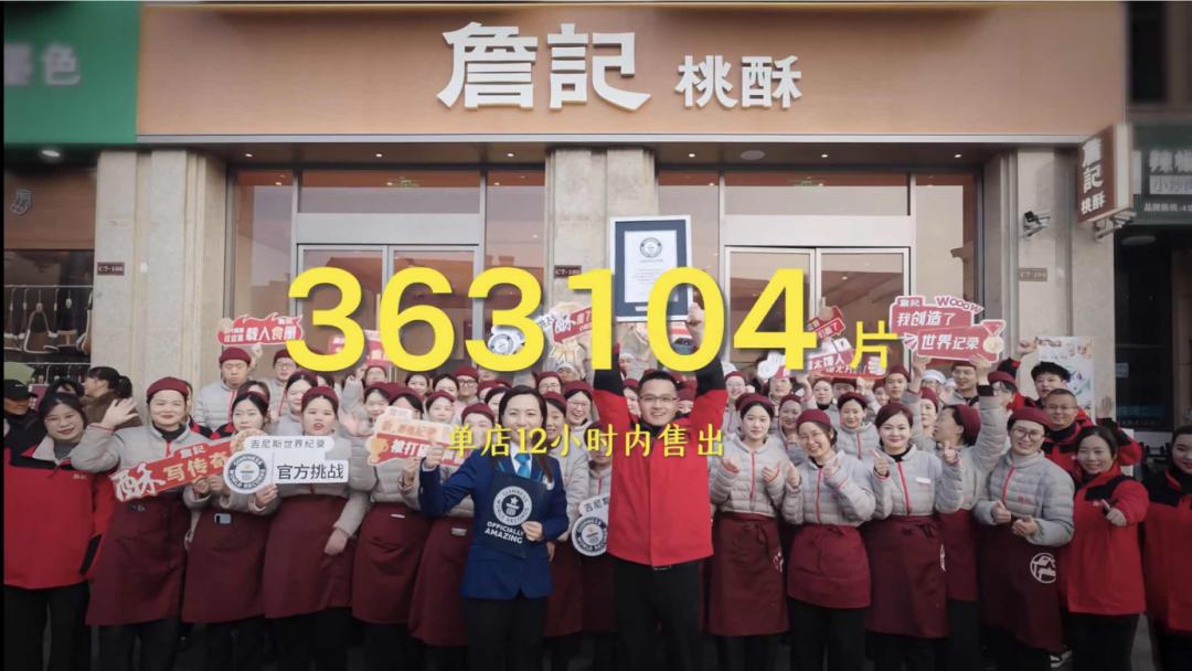 “三件套”爆火后,詹记也从全国抽调了近200名员工支援广德门店,为保障供货稳定,其合肥工厂线更是开启24小时不间断运转模式。1月1日,詹记广德店宣布桃酥的销量定格在363104片,同卡旺卡一样申请了吉尼斯世界纪录。