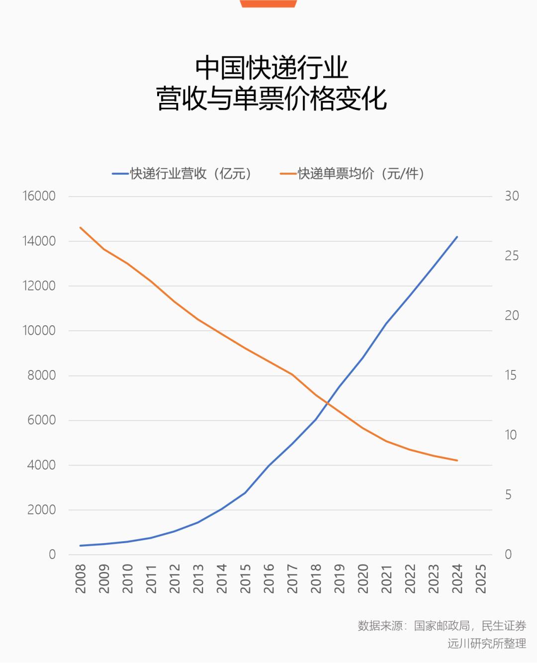 尽管有关部门反内卷动作不断,单量上涨、单价下滑的趋势,在快递业已经持续了整整十七年。