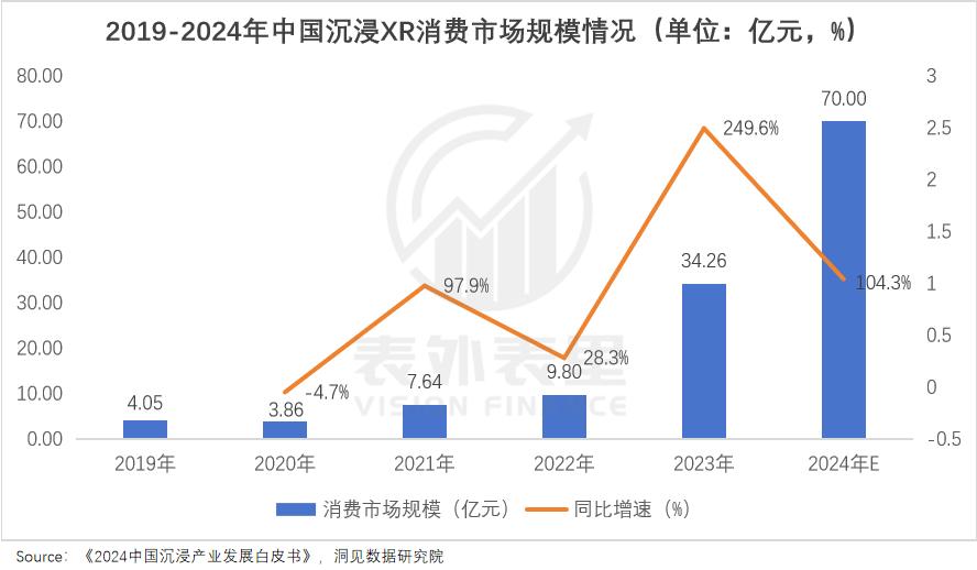 “整个行业热火朝天。”他亲眼见到VR体验馆,从平均每座城市两三家,进化到每个商圈两三家。数据也显示,国内沉浸XR消费市场规模在2023-2024年翻倍增长,达到70亿小高峰。
