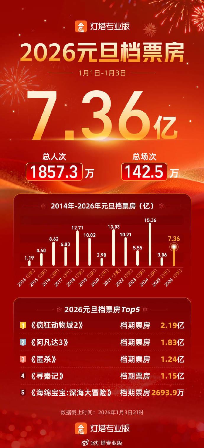 据灯塔专业版数据,截至1月3日21时,2026年元旦档(1月1日-1月3日)票房7.36亿元,观影人次达到1857.3万。元旦档票房前五分别是《疯狂动物城2》、《阿凡达 3》、《匿杀》、《寻秦记》、《海绵宝宝:深海大冒险》。