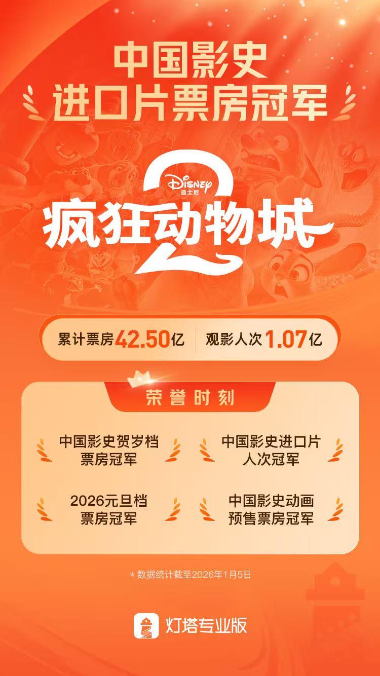 《疯狂动物城2》打破多项纪录,包括元旦档票冠、贺岁档票冠、首部人次破亿进口电影、中国影史进口动画票房冠军等,并已于1月5日超越《复仇者联盟4》登顶中国影史进口片票房榜。
