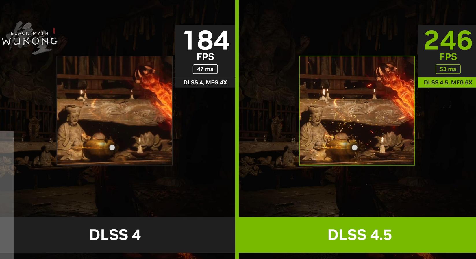 不过,英伟达还是给游戏玩家们带来了一些惊喜,比如最新的DLSS 4.5,在DLSS 4的基础上将多帧生成的上限从4帧升级到6帧,等于RTX 50系显卡的用户可以喜提免费的50%帧数提升了。