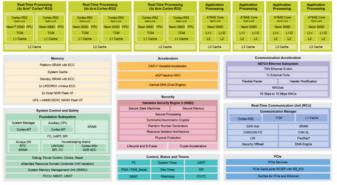 算力方面,包括8个分锁Cortex-A78AE@1.8 GHz、12个分锁Cortex-R52@1.4 GHz、基于RISC-V的网络、数学和数据密集型加速器、eIQNPU、独立保险系统管理器、独立安全通信管理器、独立housekeeping controller。存储方面,包括2x LPDDR4X/5/5X DRAM接口、36MB SRAM、2x channel NVM、1x UFS 3.1接口、支持eMMC 5.1 NAND Flash和SD Card/SDIO flash。