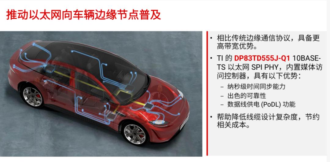 10BASE-T1S在汽车中的发展速度很快,为了将以太网扩展至车辆边缘节点,TI推出了首款10BASE-T1S产品DP83TD555J-Q1。它具有纳秒级的时间同步能力,在几秒钟内就可以对安全做出决策;也可以拓展其他功能,比如照明控制、车窗控制乃至未来音频同步;它还具有数据线供电功能,可以在同一根线路上同时传输电力和数据。总得来说,这款产品能够帮助降低线缆设计复杂度,节约成本。