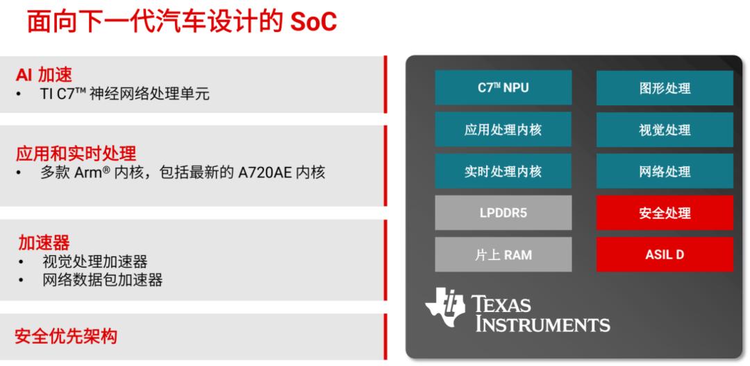 跨域融合是汽车SoC当前发展的重点。TDA5算力极为强大,实现了单芯片跨域融合ADAS、IVI及网关应用,最高1200TOPS,能效比超 24 TOPS/W。搭载8个最新的Cortex-A720AE车规CPU内核、6个Arm Cortex-R52+、Imagination的DXS系列GPU,还搭载了TI最新一代C7 NPU,AI算力较前代产品最高可提升 12倍。同时采用UCIe接口 (Chiplet),扩展性非常强大。开发方面,TI 正与新思科技 (Synopsys) 合作推出 TDA5 SoC 虚拟开发套件。