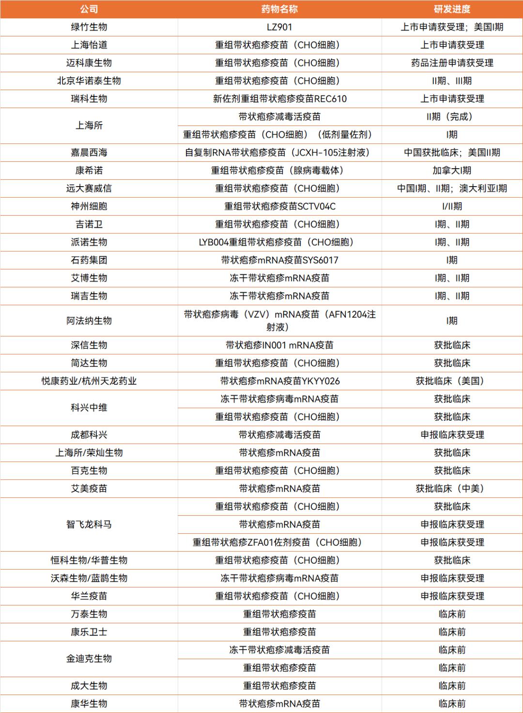 国内带状疱疹疫苗临床进度(数据来源于网络,如有遗漏,欢迎联系指正)数据来源:药时空