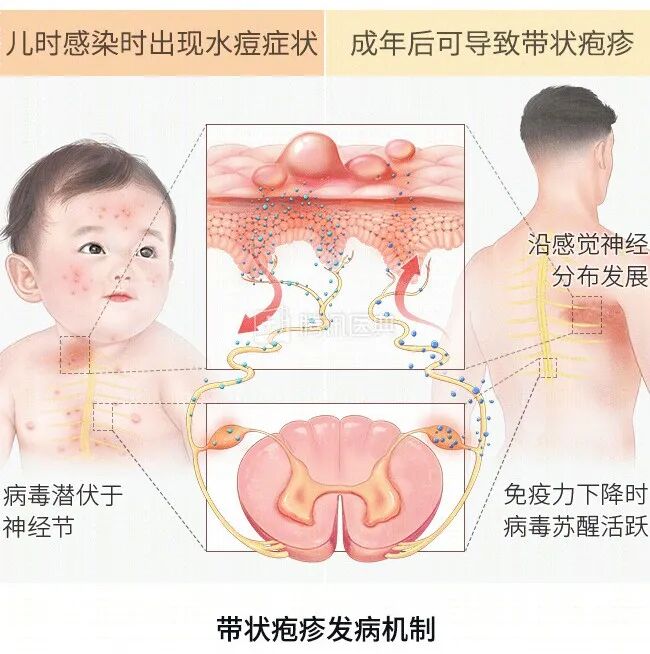 带状疱疹是由在体内休眠的水痘带状疱疹病毒(VZV)再激活引起的病症,该病毒与导致水痘的病毒相同。当个人对VZV的免疫力由于衰老或免疫抑制等因素而减弱时,通常会发生这种再激活,主要影响老年人。该疾病的症状包括疼痛、全身不适、发烧、寒战、肌肉酸痛、头痛、搔痒、麻木及明显的皮疹。带状疱疹痊愈后,病毒可在背根神经节及颅神经节内长期处于非活性状态,可能长达数十年。