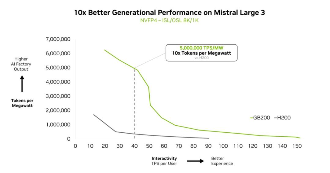 另外,在SemiAnalysis InferenceMax测试中,DeepSeek-R1将每百万token的成本降低10倍以上。包括Mistral Large 3在内同样获得了十倍加速。
