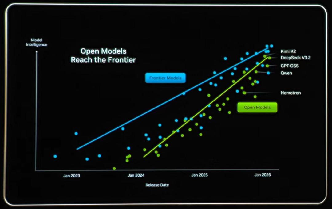 老黄主旨演讲上,中国大模型Kimi K2、DeepSeek V3.2,以及Qwen赫然上屏,位列全球开源大模型前列,性能正在逼近闭源模型。