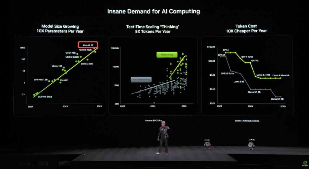 另外,在计算需求暴涨这页PPT上,480B的Qwen3和1TB的Kimi K2成为代表性模型,验证了参数规模每年以十倍量级scaling。