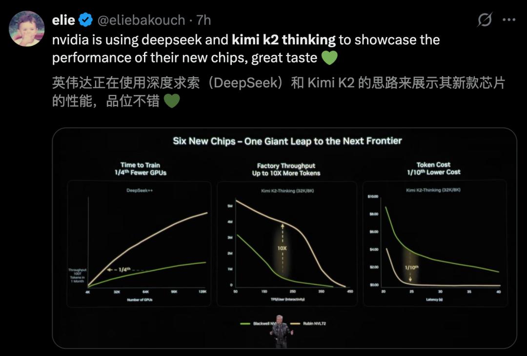 在下一代Rubin架构亮相的核心环节上,老黄还选用了DeepSeek和Kimi K2 Thinking来秀性能。