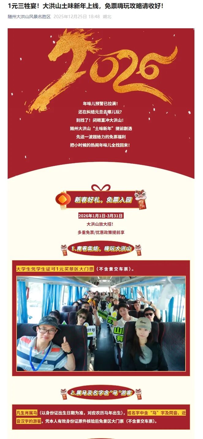 “随州大洪山风景名胜区”微信号则在2025年12月底发文称,2026年1月1日-3月31日,凡生肖属马(以身份证出生日期为准,对应农历马年出生),或名字中含“马”字及同音、近音汉字的游客,凭本人有效身份证原件核验后免景区大门票(不含景交车票)。