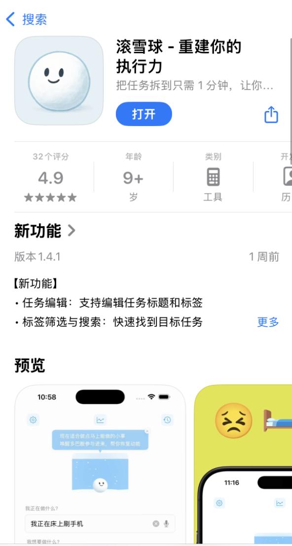 好处是有一种「摘果子」的感觉,走一步摘一个,反馈链条缩到最短。但坏处是:一旦进入心流,可能会直接忘记需要点击完成——比如我在使用过程中经常就出现这种情况,成功起床洗漱了,然后……直接忘了手机里雪球还在滚。