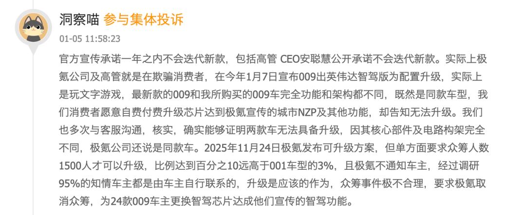 然而这句话仅说了几个月,在2025年1月,极氪就宣布009推出英伟达智驾版为升级版。赵鑫表示,这款新车型不但功能和架构都不同,并且还具备城市NZP等功能,而在他购买的老款车型上,这样的智能功能直到现在依然没有推出,而此前官方曾承诺相关功能会在2025年内为老车主升级。