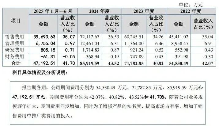 对比来看,2022年至2024年以及2025年上半年,英氏控股销售费用分别为4.54亿元、6.02亿元、7.21亿元和3.97亿元,三年半合计21.74亿元,约占营业收入的35%,为研发费用的54倍。