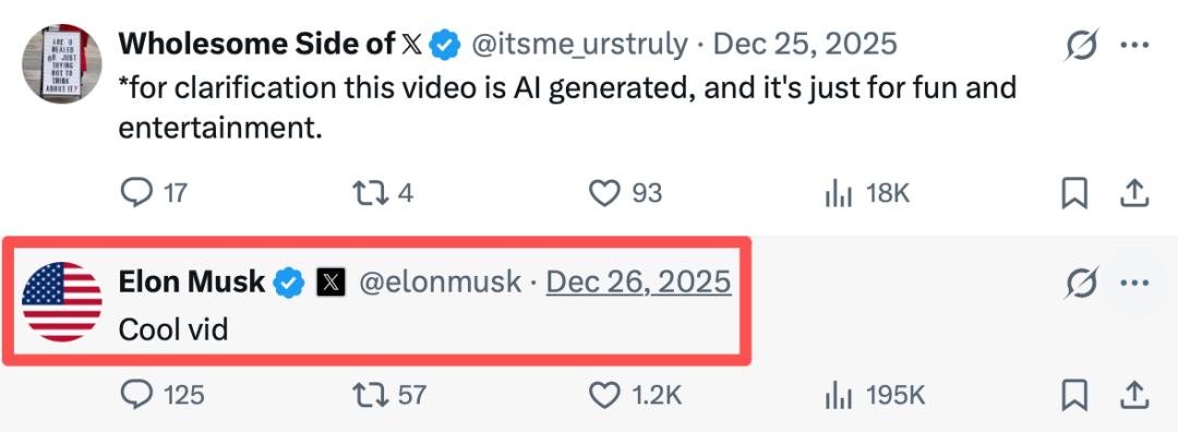 埃隆・马斯克先现身评论区为这条AI视频点赞。
