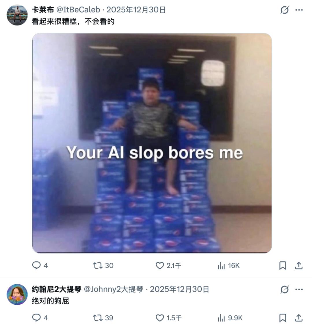 当然,也有始终不认可AI“污染”传统影视作品的网友,认为这是典型的slop(slop:通常由AI批量生成、毫无逻辑和营养的低质量内容,被《韦氏词典》列入2025年度热词)。