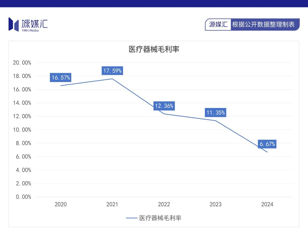 作为经销商,步长制药的利润空间高度依赖上游品牌方的定价。在集采导致的行业性降价潮中,品牌方对经销商的供货价同步被大幅压缩,这直接导致了步长制药2022年毛利率显著下滑。这种挤压趋势持续进行,至2024年,步长制药医疗器械的毛利率已降至6.67%。