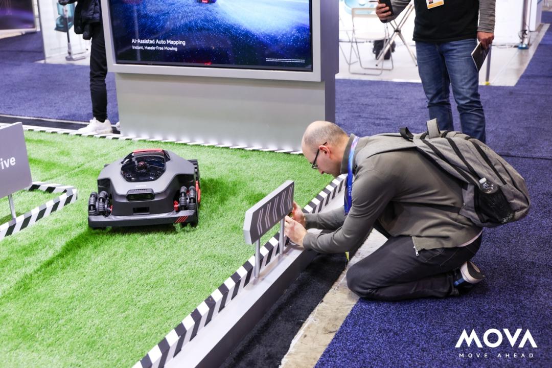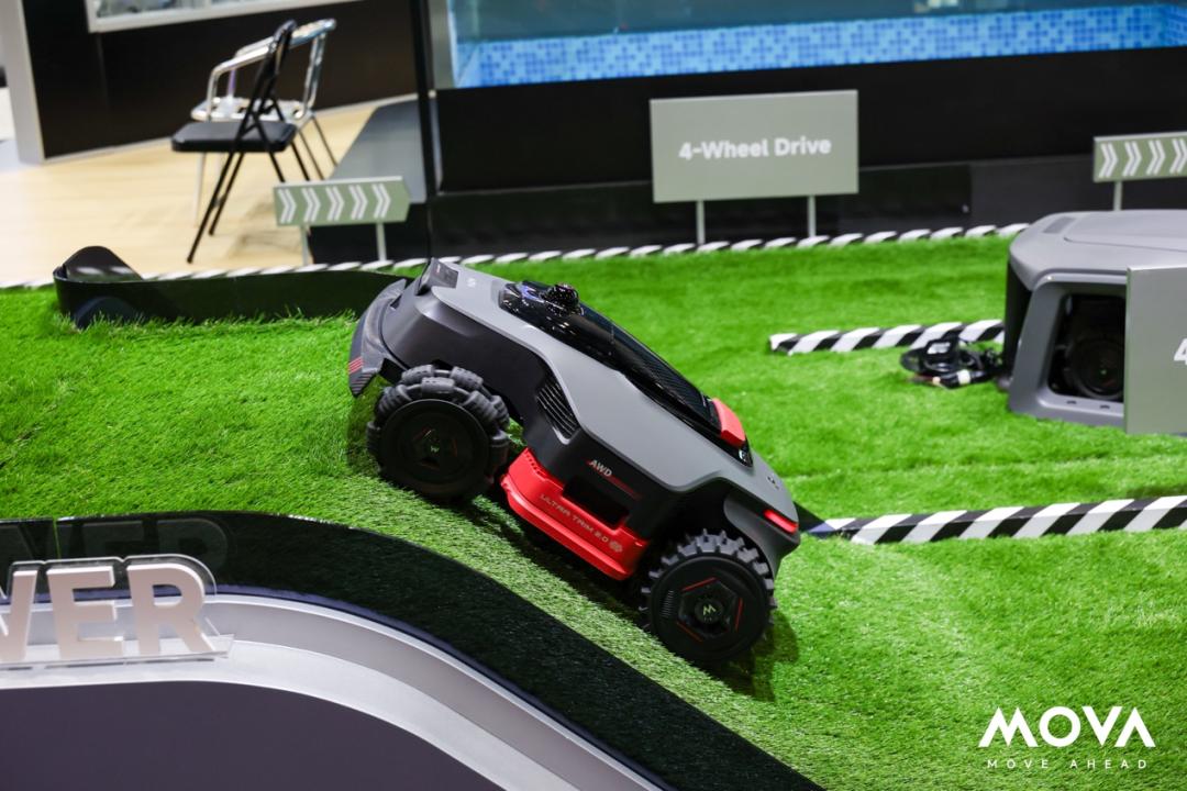 在 MOVA 展台一侧的水箱中,仿生机械臂泳池机器人 Rover Master 正在进行演示,一支拥有6个自由度的机械臂,灵活地从角落抓取着漂浮物。不远处的草坪模拟区,越野级割草机 NAVAX AWD 也在演示攀爬80度的陡坡。