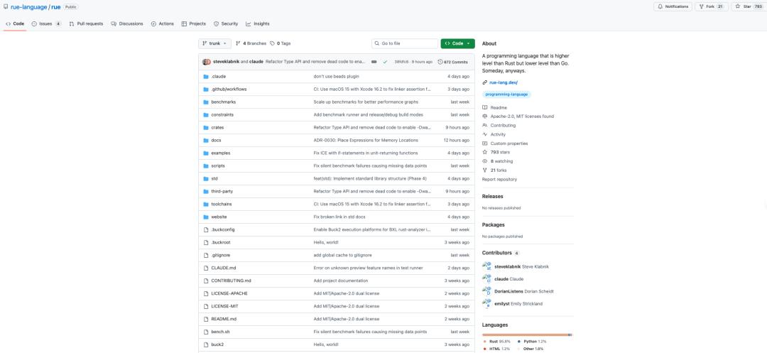 Rue 大量使用 Rust 编写,其开发过程中高度依赖 Anthropic 的 Claude AI 模型。