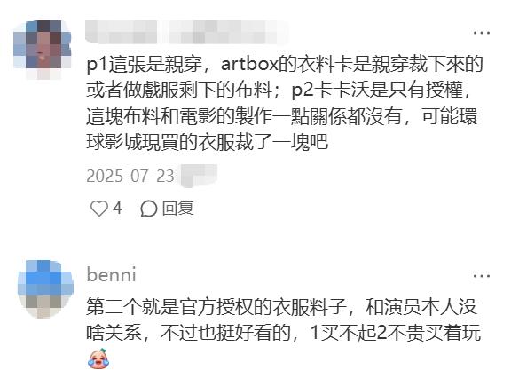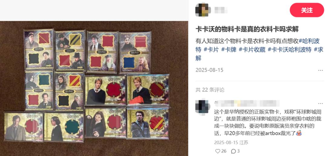 卡卡沃《哈利波特》系列的成功,很大程度上也归功于优质的卡面选图与丰富的卡位设计。该系列中,演员亲签卡和角色印签卡的市场评价都相对稳定,但部分粉丝对“物料卡”的营销表达过不满:这类卡牌并非电影制作过程中的周边,而是经环球影城授权,由成品布裁切而成,却一度被炒到高价,引发“圈钱”批评。直到“物料卡”的二级市场价格回落到普通区间,相关争议才逐渐平息。