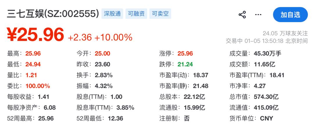 游戏的优秀表现同样获得了资本市场的注意。就在2026年开市的第一天(1月5日),三七互娱的股价出现强势涨停,并带动了整个游戏板块的活跃。