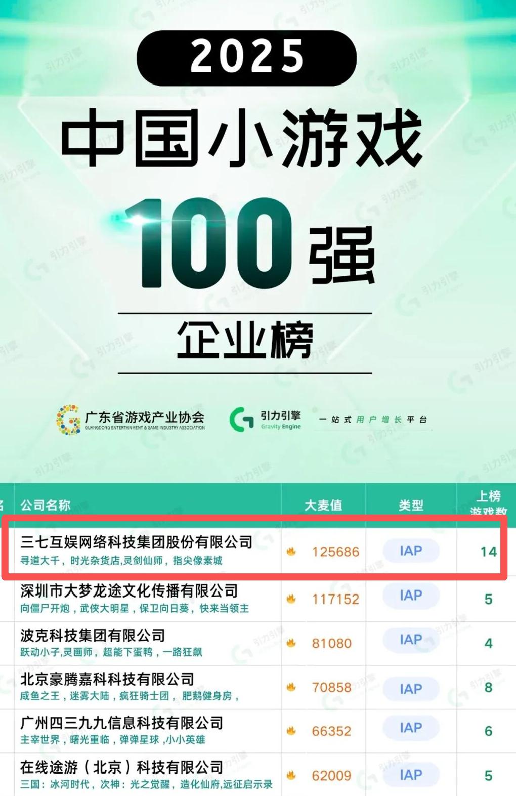 在最近广东省游戏产业协会联合引力引擎发布的《2025年中国小游戏百强企业榜》上,三七互娱优势非常明显,上榜多达14款,稳居榜首。能达到这个成绩,过去积累的大量产品固然重要,但更关键的原因在于,三七互娱掌握了一套持续产出成功产品的方法。