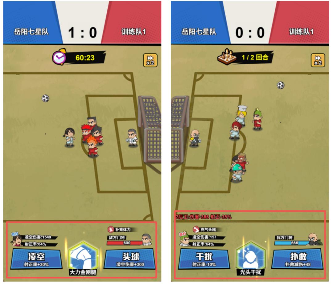 当我方要射门时,系统通常会提供几个选项,比如“凌空”、“头球”和一个球员的主动技能,玩家的任务就是根据当前双方的数值对比,选择一个成功率更高的进攻方式——当射门的伤害超过守门员的防守阈值,这一发射门就算是成功了。反之,防守的时候也一样。