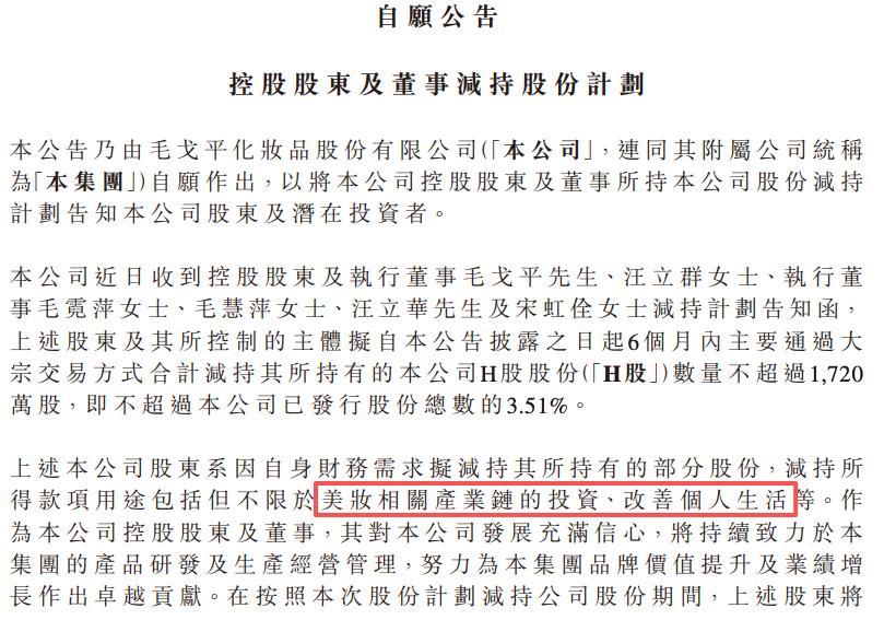 1月6日晚间,国货美妆龙头毛戈平发布公告称,公司控股股东、执行董事毛戈平、汪立群,执行董事毛霓萍、毛慧萍、汪立华、宋虹佺计划自公告之日起6个月内,主要通过大宗交易方式减持不超过1720万股H股股份,即不超过总股本的3.51%。
