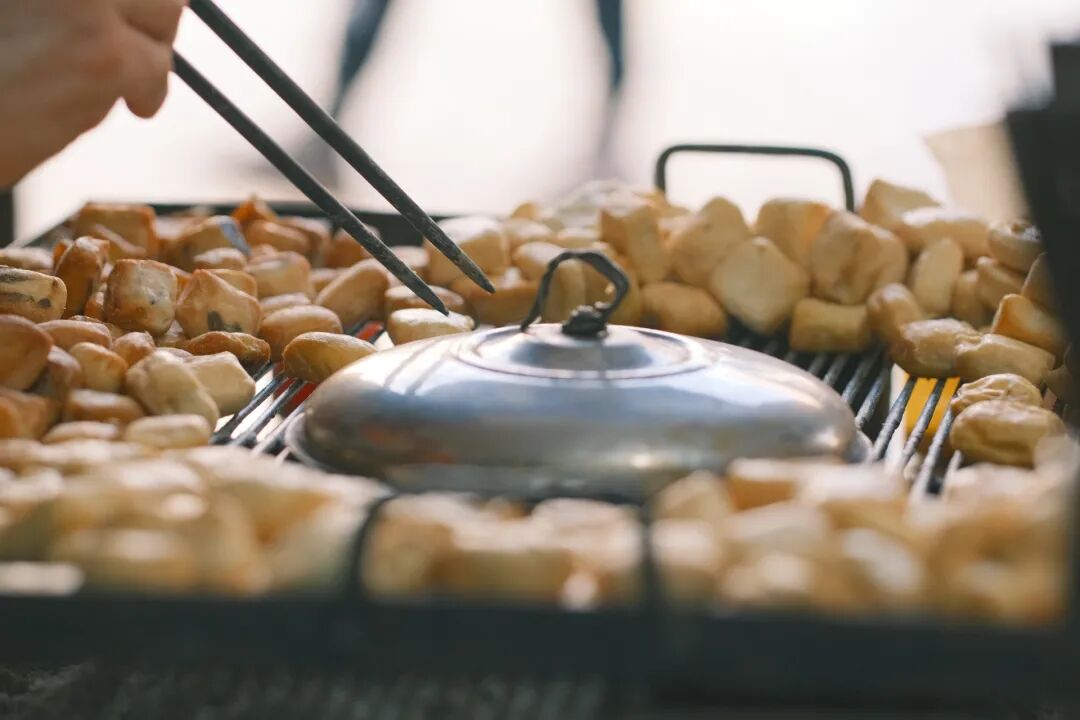 是,真的慢。我们得慢慢看着一小块一小块包浆豆腐,慢慢膨胀起来,然后慢慢有了微微的焦黄色。老板再慢慢翻个面,慢慢等上些许时间,这豆腐就可以慢慢夹过来了。放在嘴里也要慢慢地咬开。