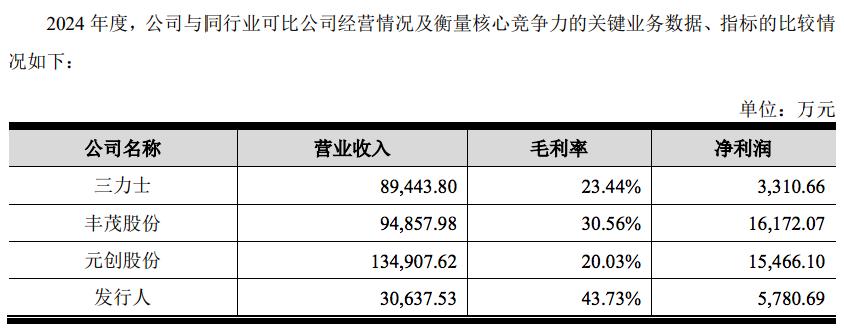根据锐牛股份在招股书中披露,同行业可比公司有三力士、丰茂股份、元创股份,年营收均在10亿元左右。数据显示,三力士2024年净利润下滑52%;元创股份2024年净利润下滑13%;唯一实现增长的丰茂股份,2024年净利润增速也仅为17%。