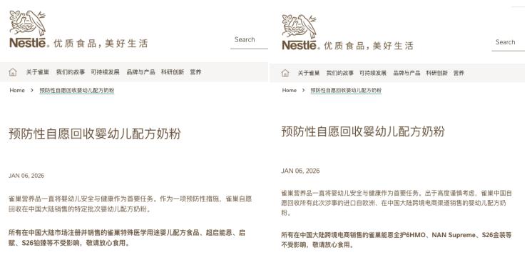 雀巢中国强调,所有在中国大陆跨境电商销售的雀巢能恩全护6HMO、NANSupreme、S26金装等不受影响;所有在中国大陆市场注册并销售的雀巢特殊医学用途婴儿配方食品、超启能恩、启赋、S26铂臻等不受影响,并“敬请消费者放心食用”。