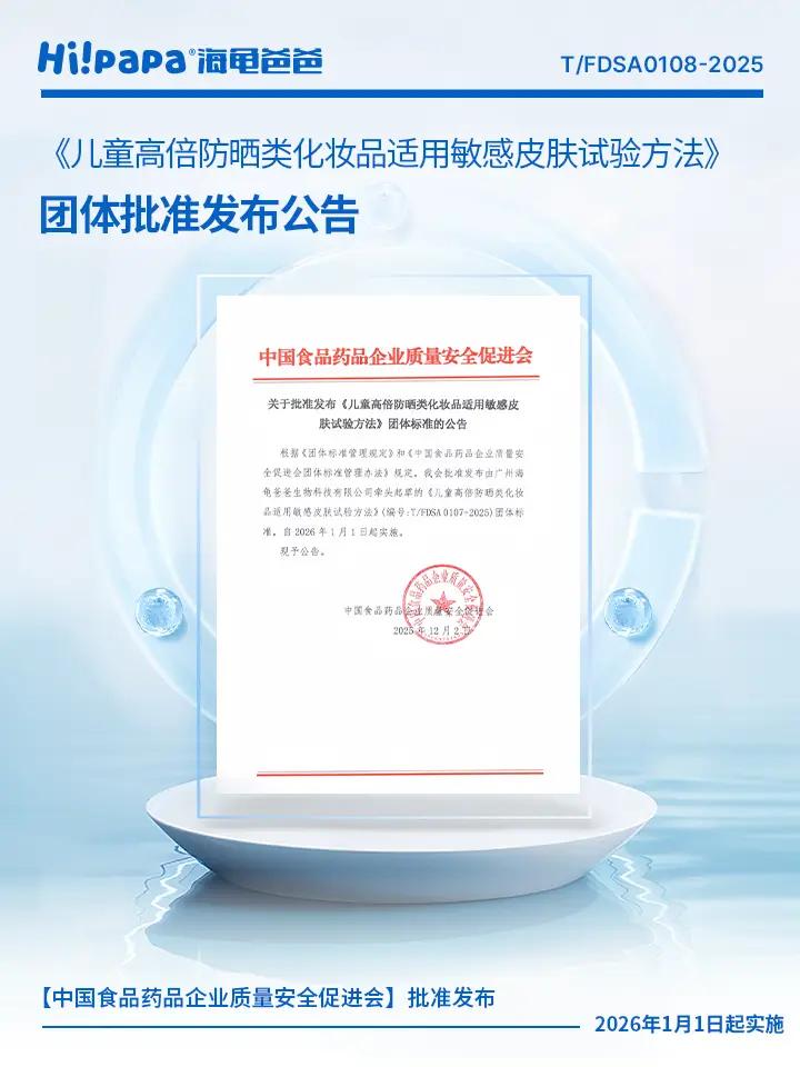 例如,2025年海龟爸爸牵头制定、发布国内首个“防晒清水可洗”团体标准和《儿童高倍防晒化妆品适用敏感皮肤试验方法》团体标准。其中,“防晒清水可洗”团体标准是中国首个聚焦于防晒产品使用清洗方法便捷性和安全性而制定的团体标准。