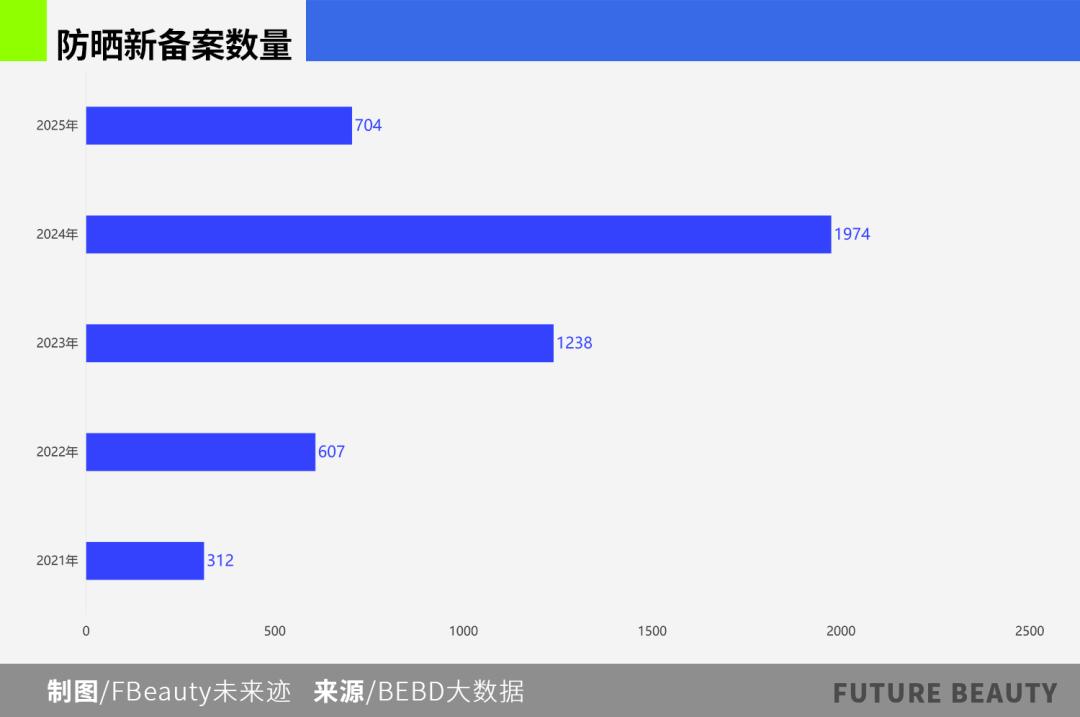 从产品备案数据来看,2021年至今,市场上防晒产品总备案数量4835个,当前有效备案数量为4516个,整个2025年防晒新增备案近704个(注:防晒产品特证备案有效期为5年,已有产品迭代可更新备案,不用重新注册)。这意味着,自2021年防晒特证管理以来,去年是市场上防晒产品最丰富的一年。