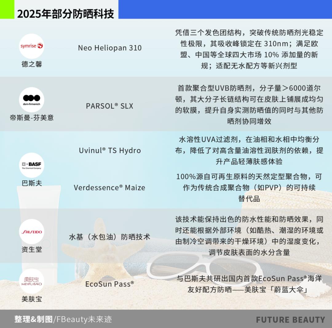 从产业链上游看,防晒产品的肤感、成膜性和环境友好依旧是这一品类开发的基本功,而巴斯夫、德之馨、帝斯曼等防晒剂开发商去年推出的核心技术正是瞄准这一方向。