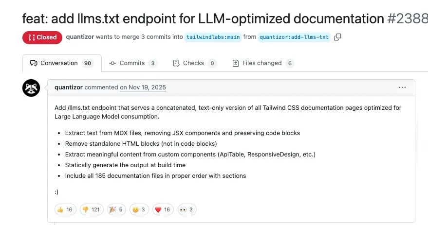 2025 年 11 月,社区开发者向 Tailwind 官方仓库提交了一项合并请求,要求新增一个 llms.txt 端点,用于提供面向 LLM 优化的 Tailwind CSS 全部文档的纯文本合并版本。以此希望在所有文档页面加一个“复制为 Markdown”的按钮,因为现在很多人会把文档内容直接喂给 AI。