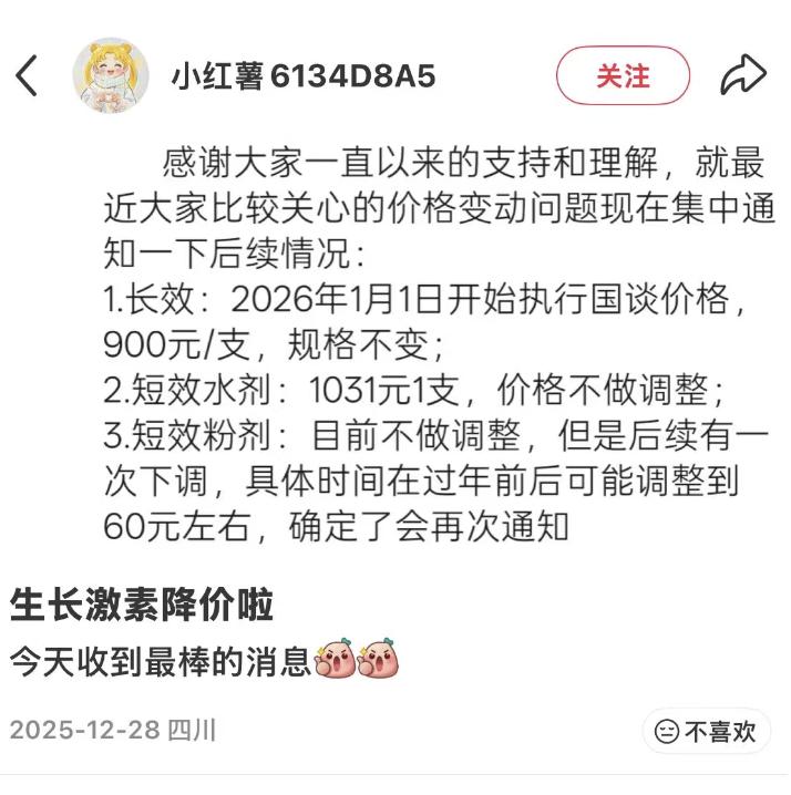 生长激素的降价也在社交平台引发热议,有家长晒单分享最新采购价,还有网友直接贴出医保目录对应的调价明细,直观的价格差,也让不少家长纷纷跟帖,就产品的替换展开了讨论。