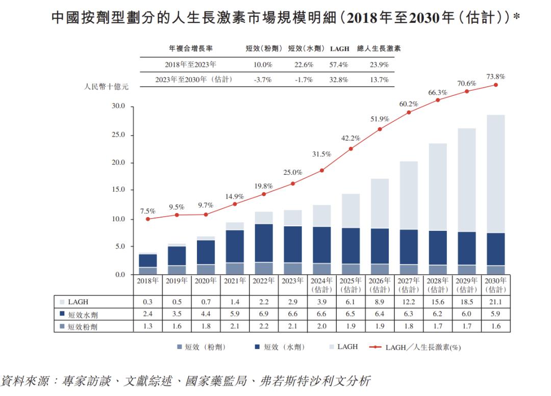 与此同时,长效生长激素的年复合增长率将持续走高,据维昇药业招股书引用的数据显示,预计到2030年,长效产品占国内整体生长激素市场的份额将达到73.8%,而短效粉针与短效水针的年复合增长率则显现出下行态势。