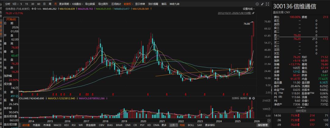 而到了2025年12月,熟悉的剧本似乎又再重演,信维通信股价单月涨幅接近100%,2026年开年更是直接刷新历史新高。1月8日,其收盘价为76.2元。