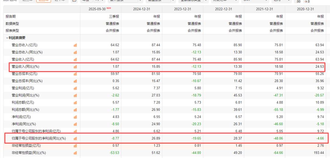 到了2025年,情况依然没有扭转,前三季度,营收增速仅剩1.07%,几乎原地踏步,归母净利润同比还倒退了8.77%。