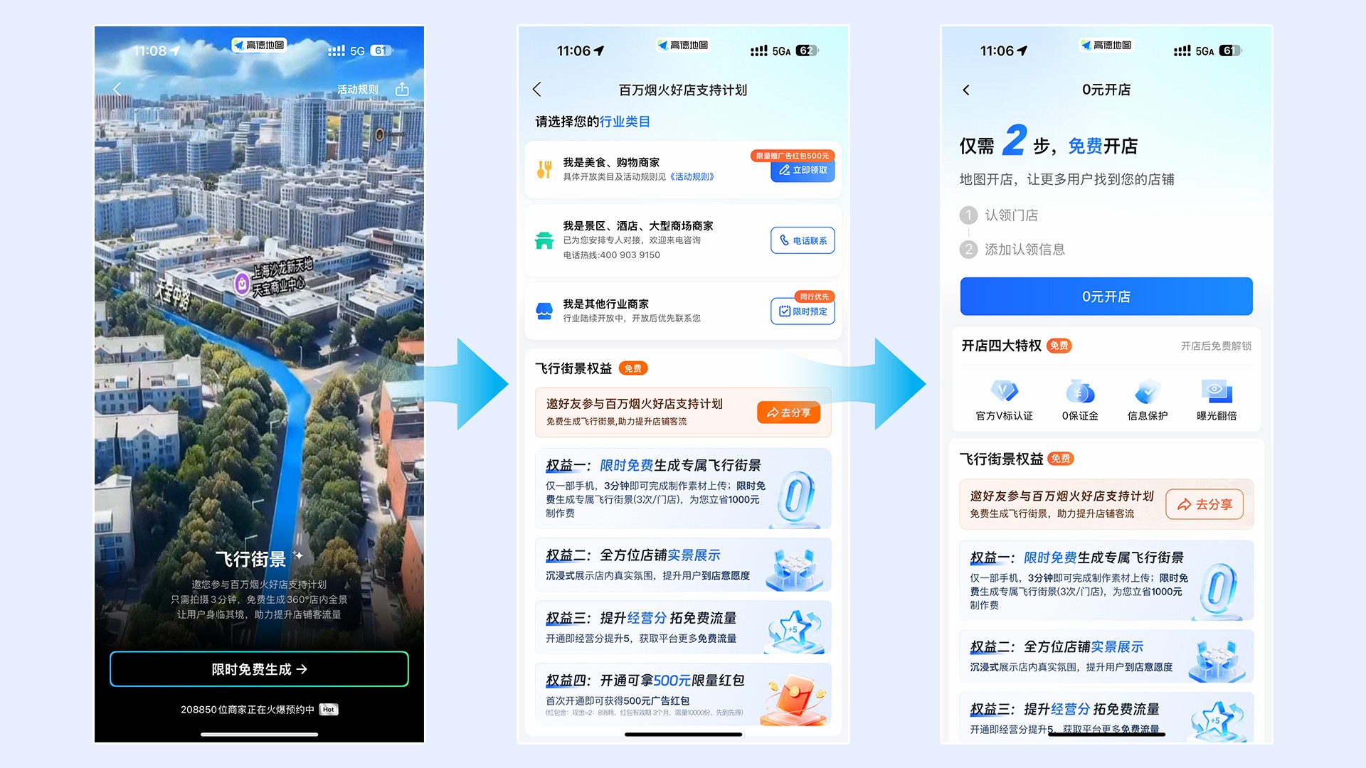 高德“百万烟火经济支持计划”开启首日,超20万商家预约“飞行街景”