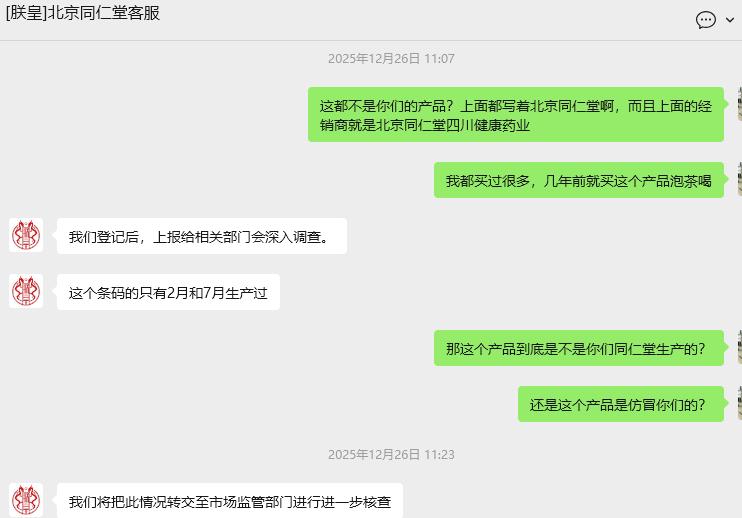 经过客服查询后,对方告知,赵先生购买的这个产品条码在官方系统中无记录,也就是说并非是北京同仁堂四川健康经销的产品。