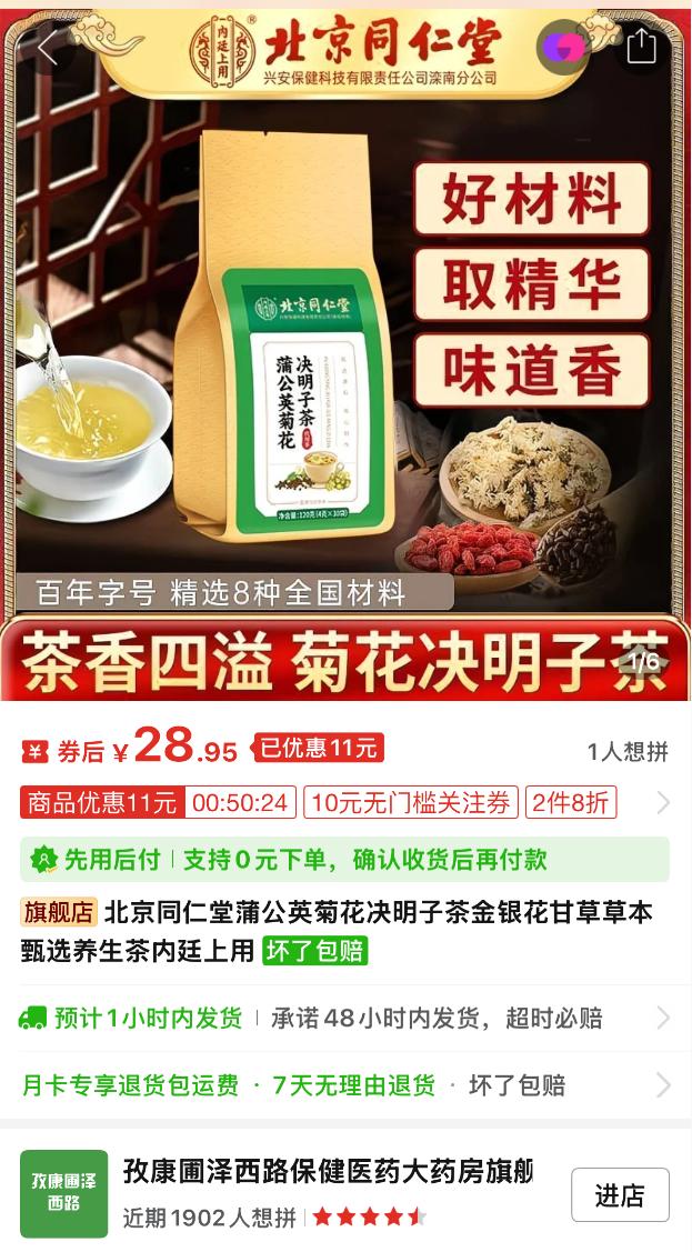 当赵先生在拼多多“华益康商贸”店铺拍下那袋印着“北京同仁堂”标识的蒲公英菊花决明子茶时,他并未想到,他常年喝的“老字号”同仁堂养生茶,竟然跟同仁堂没有关系。