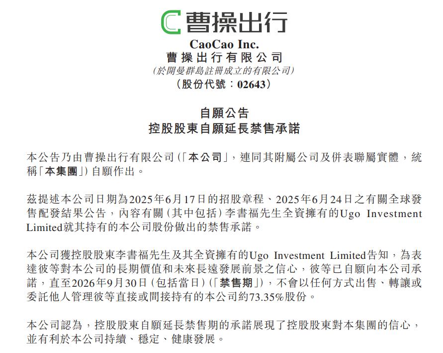 值得一提的是,在收购官宣不久后,曹操出行控股股东李书福还释放了更积极的信号。其发布了一份公告,承诺至2026年9月30日(包括当日),不会以任何方式出售、转让其当前直接或间接持有的公司73.35%的股份。