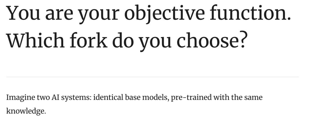 想象两个AI系统:相同的基座模型,用同样的知识预训练。一个为参与度优化;另一个为实用性优化。它们从同一个起点出发。但它们有不同的目标函数。六个月后,它们变成了两个物种。