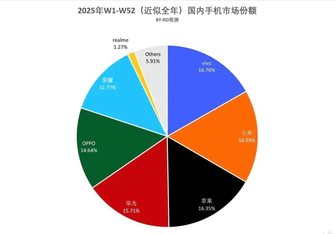 荣耀手机的市场轨迹近两年正经历剧烈波动,2025年,荣耀在中国市场的全年份额为12.77%,比2024年的14.79%下滑了约2个百分点,是当年TOP6品牌中跌幅最大的一家 。